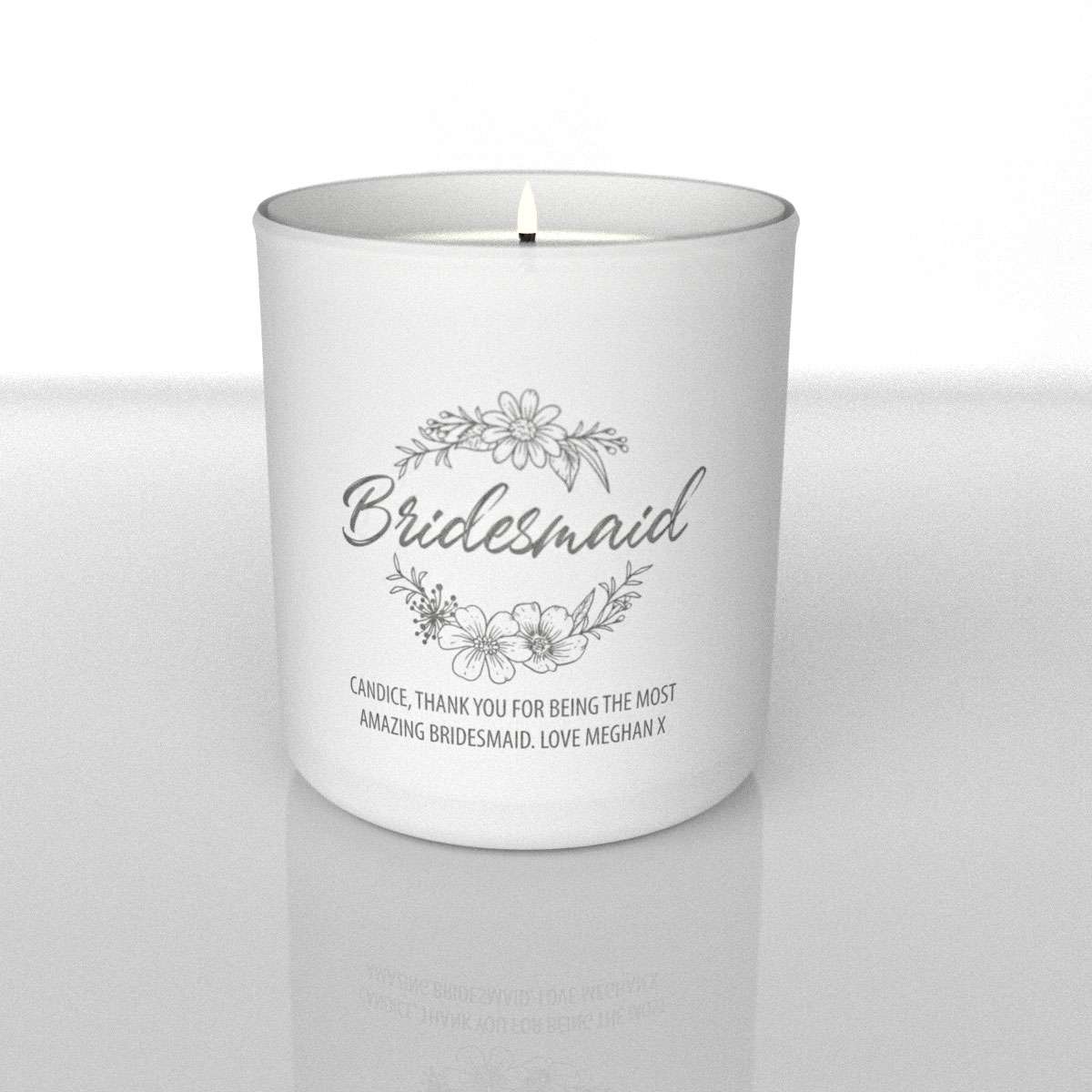 Our personalised candles are filled with a delicately scented vanilla soy and paraffin wax that emits a beautiful fragrance which lingers around the room. Each candle comes in a quality glass jar with matt white outer finish with your design precision laser engraved exposing the glass allowing light to shine through creating a beautiful and unique finish. The candle is complete with a box, perfect for gifting.